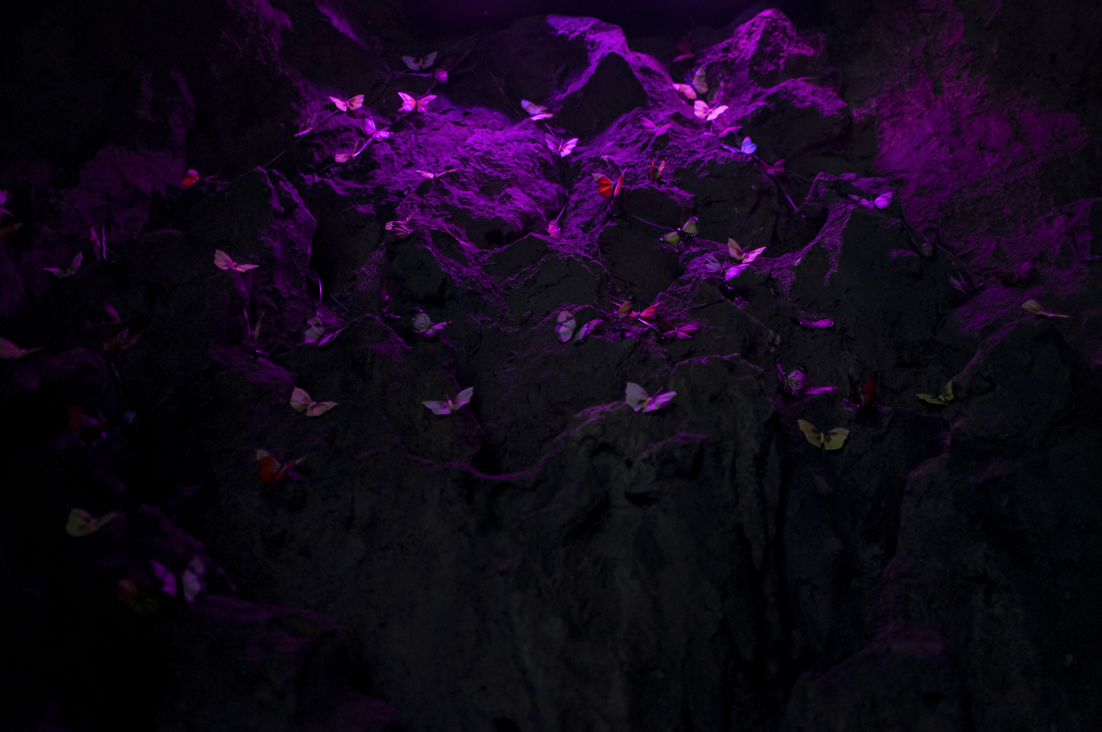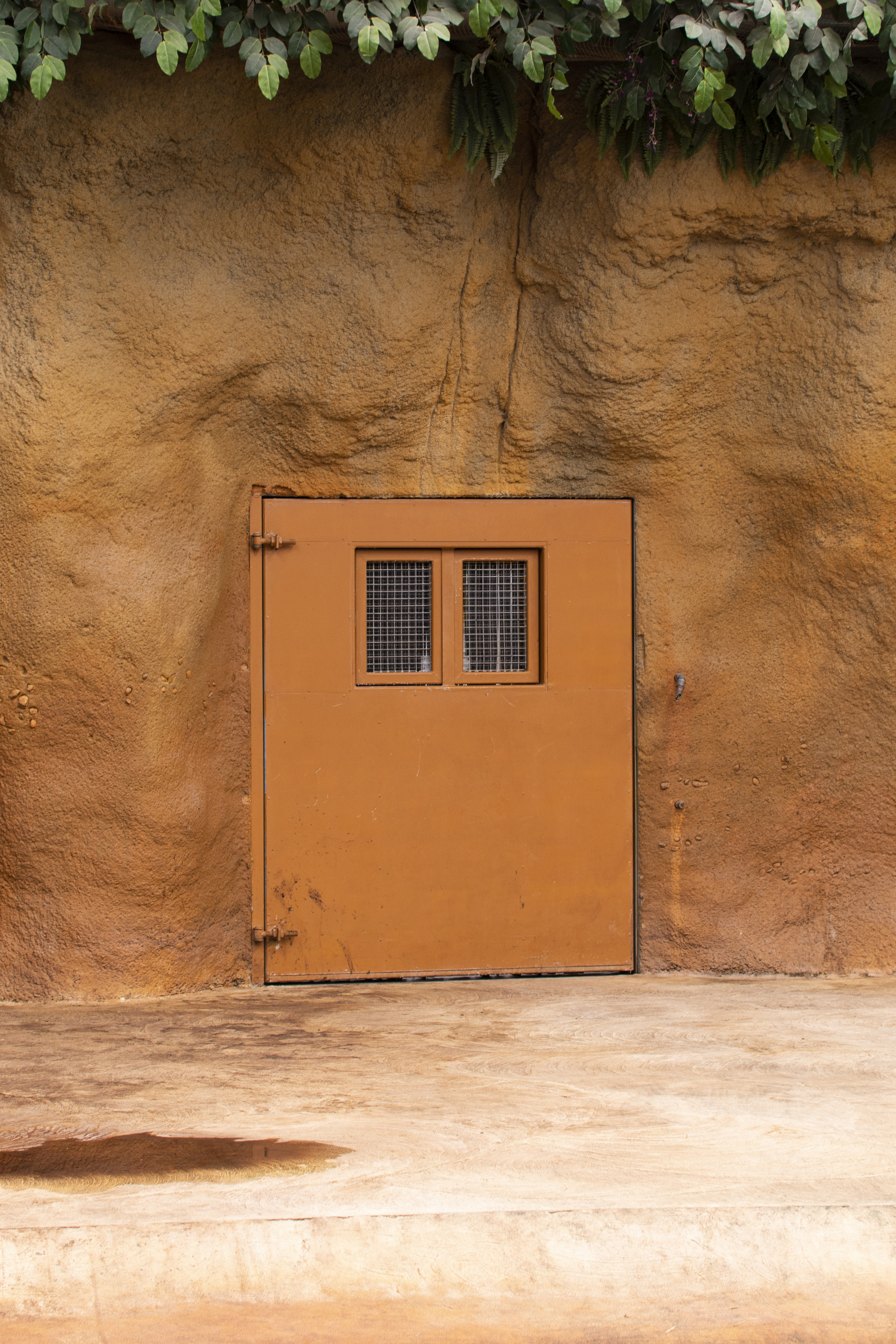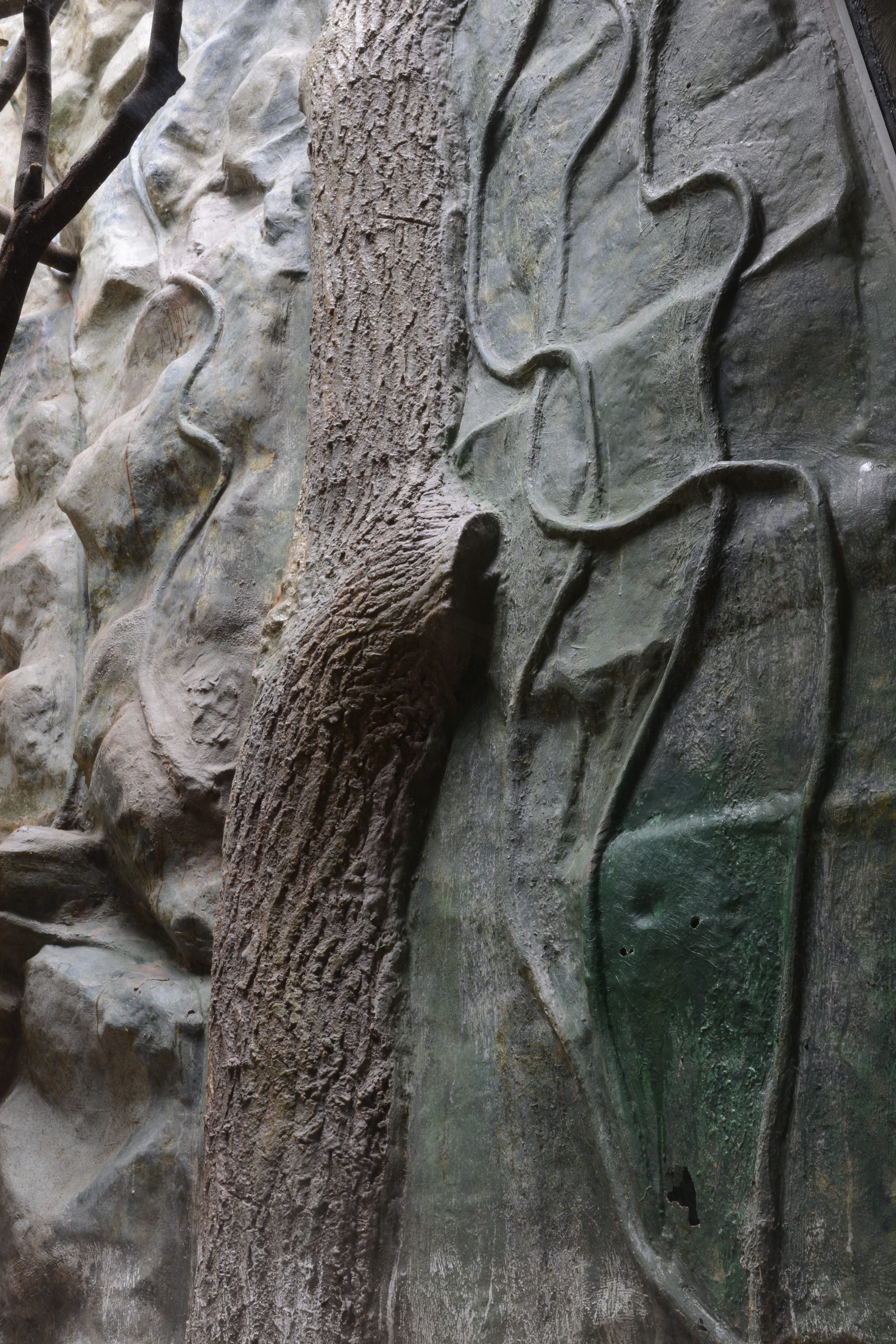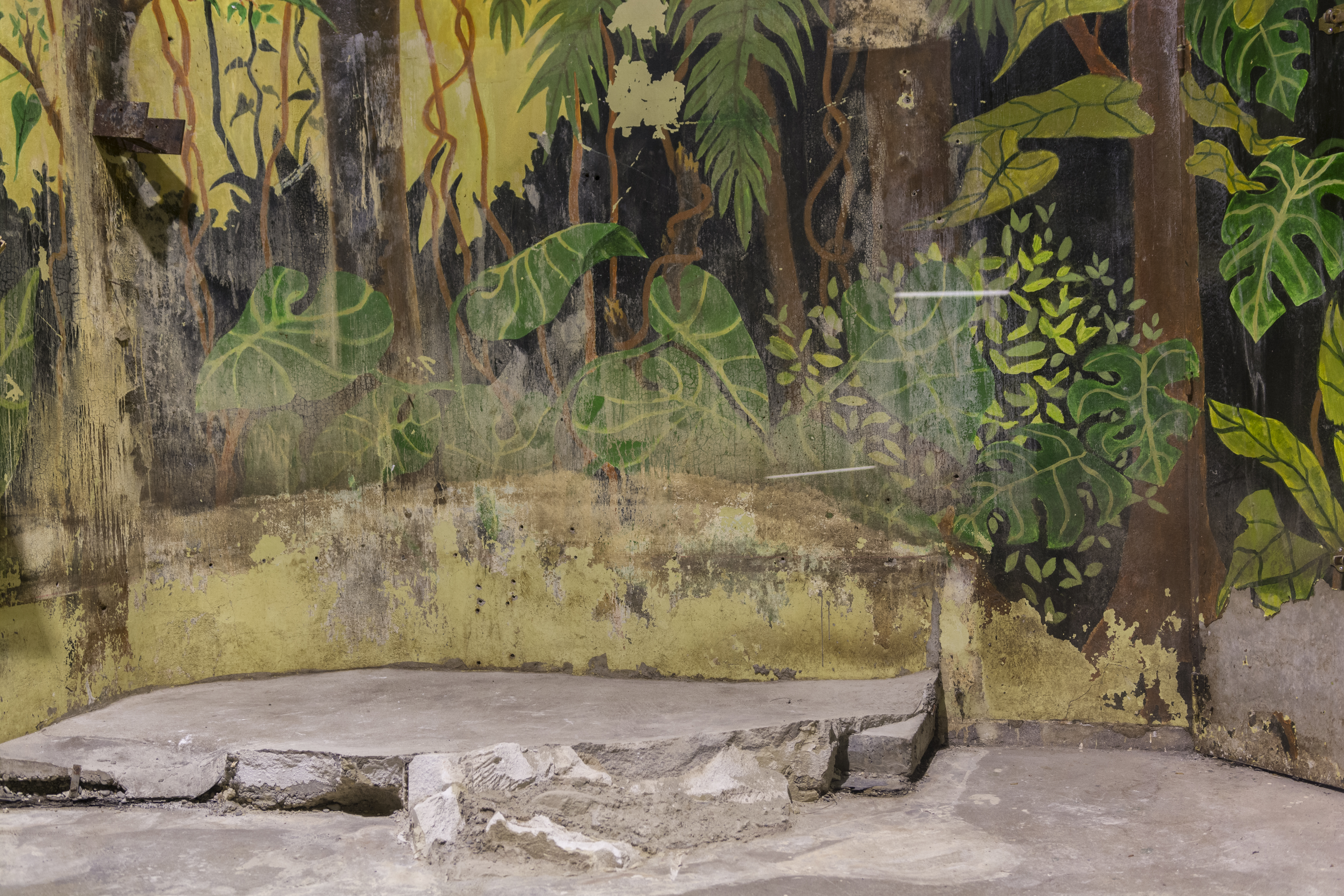 Illusionistic natural habitats, idealized and simplified to meet the demands and experiences of visitors, rather than the animals caged inside. Painted canvases, stuffed butterflies, a plastic cactus, impressive fake rocks, ... A piece of wild recreated nature as a backdrop.